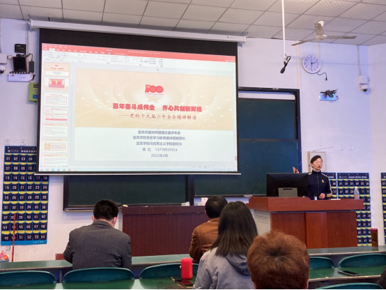 为全面深入学习宣传贯彻党的十九届六中全会精神,深刻把握全会重大意义和精神,4月6日下午,宜宾学院党史学习教育宣讲团副团长、马克思主义学院副院长黄红到理学部为师生党员作题为《百年奋斗成伟业 齐心共创新辉煌》的十九届六中全会精神专题宣讲。本次宣讲会由理学部党总支副书记(负责工作)刘敏主持。