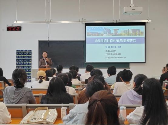 讲座伊始,黄多辉首先对杨涛的到来表示了热烈欢迎,并对其进行了介绍。杨涛主要从事非线性动力学与控制研究工作,致力于将非线性优势应用于振动控制、能量俘获、结构健康监测、微纳米机电系统等工程领域。