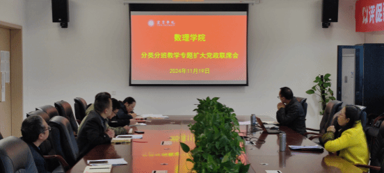 为提升数理学院教学质量,适应学生多元化发展需求,促进学生高质量就业,数理学院于2024年11月19日下午4点在临港二期六号楼421会议室召开数理学院分类分班教学专题扩大党政联席会。希望通过该方案,优化教学资源配置,重点突破专业课程教学,帮助学生更有效的开展教学技能训练和考研升学准备,提高就业质量和考研升学率。本次会议由数理学院副院长曹启龙主持,数理学院党总支书记刘敏、院长黄多辉、副书记谢润、副处级组织员孟院花、党政办公室主任李小蓉、教学办公室主任袁娣、数学与应用数学教研室主任杜保营等参会。