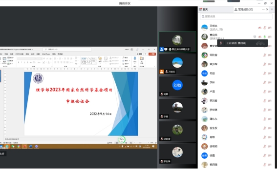 为了做好2023年度国家自然科学基金项目申报工作,提高国家自然科学基金项目申报质量,提升科研组织化水平,理学部于9月14日下午组织召开了2023年国家自然科学基金项目申报论证线上会议。会议由理学部副部长曹启龙主持,理学部党总支书记刘敏,部长黄多辉,计算物理四川省高校重点实验室主任邵菊香,赵良才教授,唐金芳教授,朱浸华教授,李林博士,万明杰博士,申报项目负责人以及理学部青年教师参加了本次会议。