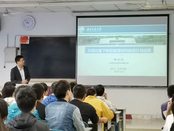2020年9月25日,西南交通大学物理科学与技术学院陈元正博士莅临我院参加学术交流活动,并面向学院大二大三学生作了《不同尺度下新型能源材料的设计与应用》的学术报告。