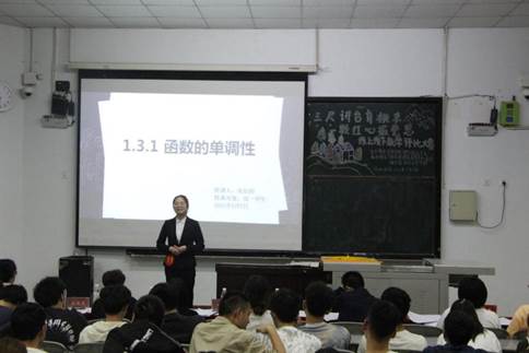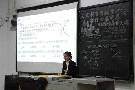 选手张廷婷比赛课题为《函数的单调性》,她带领同学们从生活中的简单函数图像中探索图像变化趋势,运用类比法,从局部至整体,定义增减函数,最后通过典例分析和习题巩固知识点。