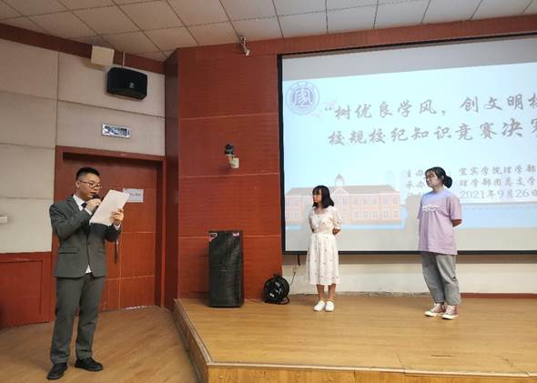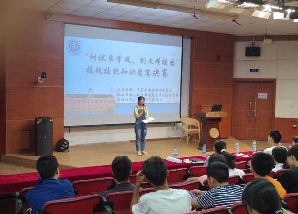 9月26日下午,为进一步弘扬爱国爱校精神、加强校纪校规教育,引导学生遵规守纪,养成良好的思想品德与行为规范,理学部在硕勋楼A101举行以“树优良学风,创文明校园”为主题的校规校纪知识竞赛决赛。出席本次活动的嘉宾有理学部团总支副书记张定萍、学生会主席彭华婷、艺术团团长孙雪莹和部分学生干部代表。