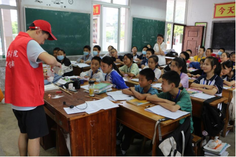 6月17日,志愿者们走进草堂中学,为中学生们讲解科学家的爱国故事并邀请他们一起制作趣味科普实验。活动过程中,志愿者们向中学生们讲述了中国航天之父钱学森、中国首位诺贝尔生理学或医学奖得主屠呦呦、中国核盾功勋林俊德等的故事。通过讲解科学家们的爱国励志故事,使中学生们感悟科学家们的爱国情怀,传承红色基因,坚定理想信念,树立报国之志。在趣味科普实验中,祝银辉同学用洗洁精和模具制作了“有趣的泡泡龙”实验,阮文庆同学用小苏打和白醋进行化学反应制作了“魔法熄灭蜡烛”实验等,神奇有趣的实验赢得了中学生们的阵阵掌声。活动结束后,草堂中学校长雷福禄对此次参与三下乡活动的志愿者们表示了感谢,他说此次活动授课精彩有趣、形式多样,为草堂中学学子增长了见识,开拓了眼界,达到了“送科技”下乡的目的。