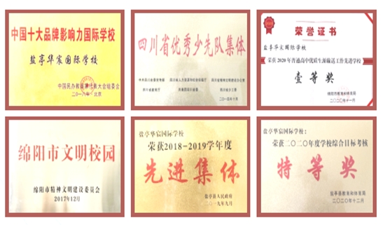 学校先后荣获国家、省、市、县表彰奖励三百余次,先后评为“全国百强民办学校”,“中国十大品牌影响力国际学校”,“绵阳市一类高中优质生源地学校”。办学质量和声誉超越了绵阳市区所有公办学校和部分民办及新体制名校,享誉巴蜀大地。