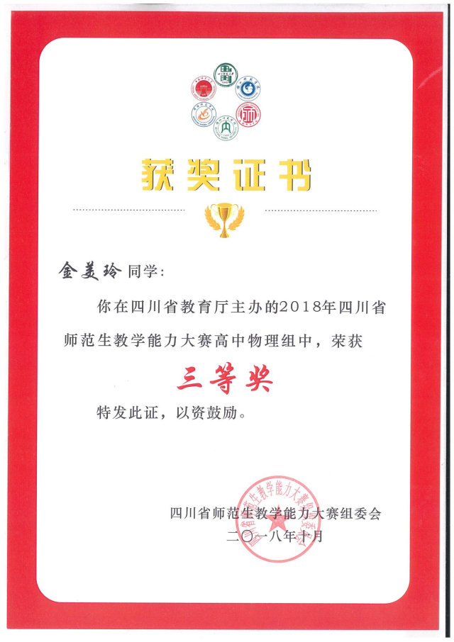 由四川省教育厅主办,四川师范大学承办的2018年四川省师范生教学能力大赛于10月25-27日在四川师范大学狮子山校区举行。我院物理学专业学生金美玲在此次大赛中表现突出,在高中物理组荣获三等奖的优异成绩。