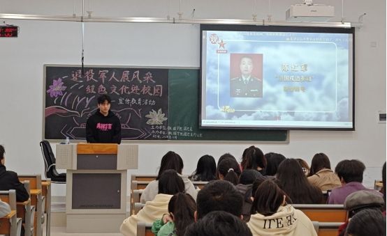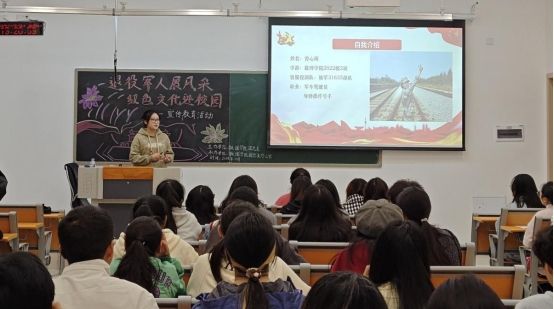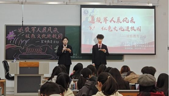 2024年11月10日,为贯彻全国教育大会精神、落实《党史学习教育工作条例》,数理学院团总支办公室在临港校区二期6号楼121教室举办“退役军人展风采·红色文化进校园”宣传教育分享会。活动由2022级退役学生王宇和曾心雨主讲,数理学院的团总支副书记兼学办副主任马翠、数理学院专职辅导员吴婧、周露及70余名低年级学生参加。